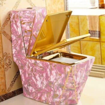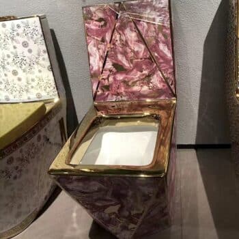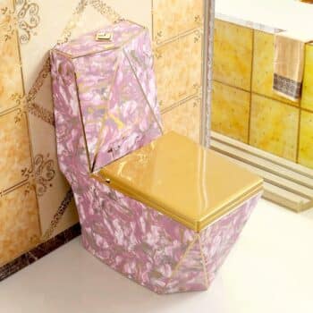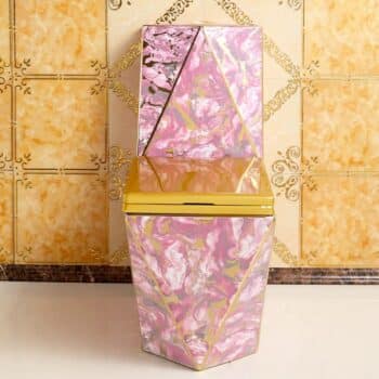 Elevate your bathroom into a realm of artistic luxury with our Angular Pink & Gold Marble Faceted Toiletโa breathtaking statement piece inspired by modern geometric architecture and opulent royal design. This extraordinary one-piece toilet combines a sculpted, multi-angled exterior with a gold-finished lid and premium gold accent lines, creating a dazzling interplay of reflections and color.