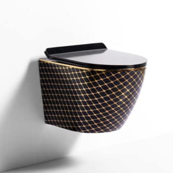 Experience the perfect blend of luxury and modern craftsmanship with this black and gold wall-mounted toilet, featuring an exclusive mesh pattern finish. Designed for premium interiors, it combines aesthetic sophistication with space-saving functionality. The glossy black surface, accented with gold mesh pattern, creates a statement piece ideal for luxury homes, boutique hotels, high-end restaurants, and modern commercial spaces.