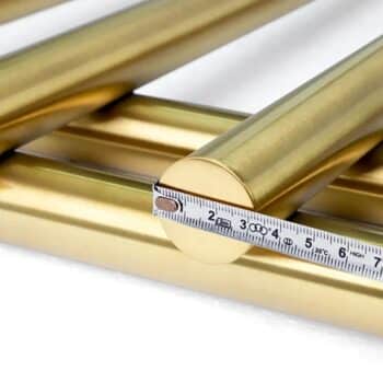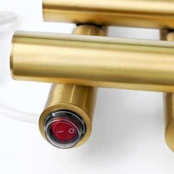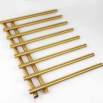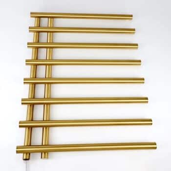 This design electric towel warmer rack is helpful upgrade for your bathroom. Designed with elegance and practicality, it quickly warms and dries towels while adding a touch of design to your modern bathroom. With a simple waterproof on/off switch and efficient heating performance, itโ€™s both functional and stylish. Made of durable stainless steel with a scratch- and water-resistant gold plated finish, it ensures long-lasting shine and reliability. Can be switched on constantly, heating temperature approximately 50ยฐC (122ยฐF), power consumption 80W/hour .
