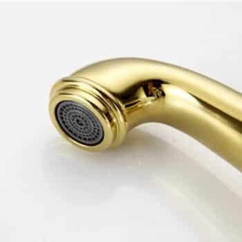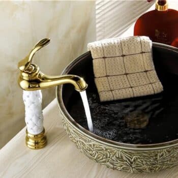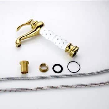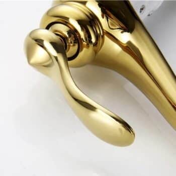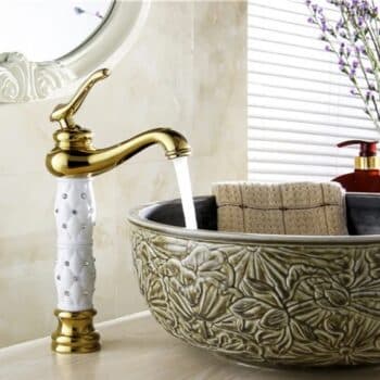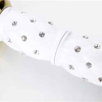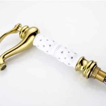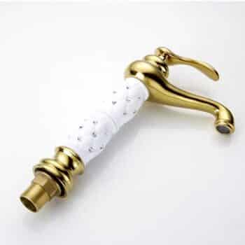 Add a touch of royal glamour to your bathroom with this Luxury Gold Faucet with Crystal-Decorated Ceramic Body. Its elegant silhouette, smooth curved spout, and mirror-polished gold finish create an instant statement of sophistication, while the white ceramic body inlaid with sparkling crystal accents brings a unique, luxurious touch.