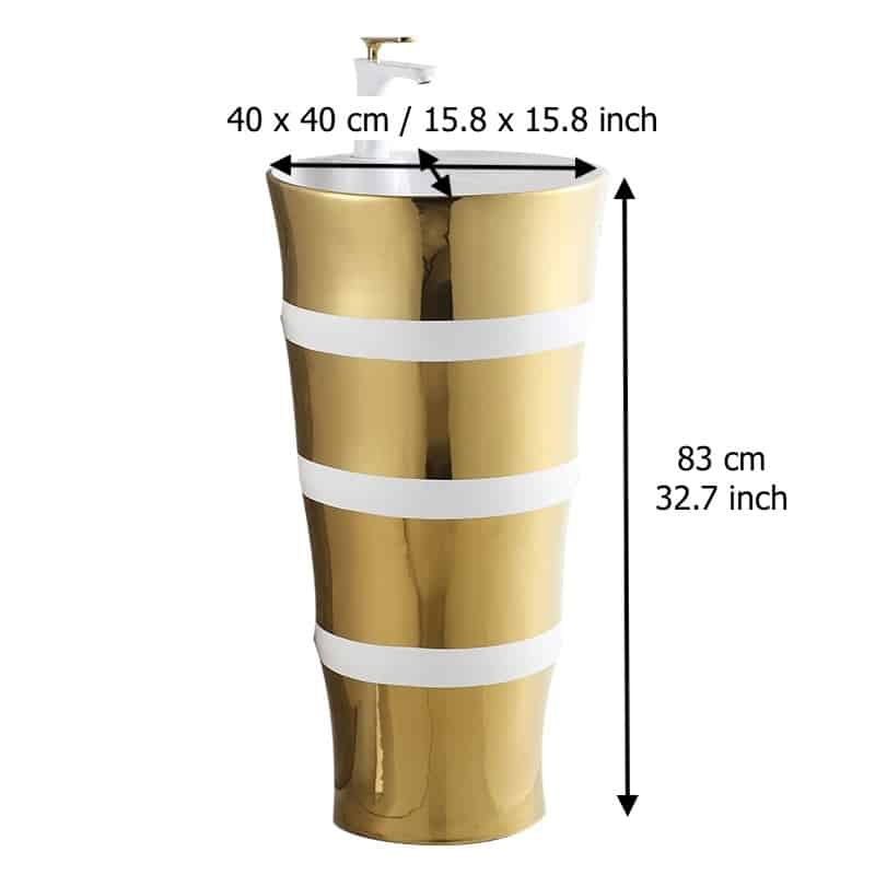 Featuring a mirror-polished gold exterior with smooth white accent stripes, this basin blends artistic design with luxury craftsmanship. The tall cylindrical pedestal form hides plumbing for a clean, hotel-style look while the smooth white interior basin ensures easy cleaning and stain resistance.