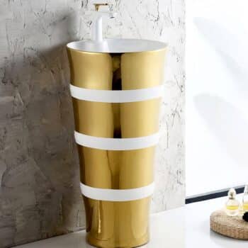 Featuring a mirror-polished gold exterior with smooth white accent stripes, this basin blends artistic design with luxury craftsmanship. The tall cylindrical pedestal form hides plumbing for a clean, hotel-style look while the smooth white interior basin ensures easy cleaning and stain resistance.