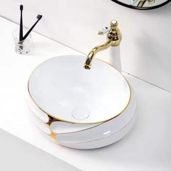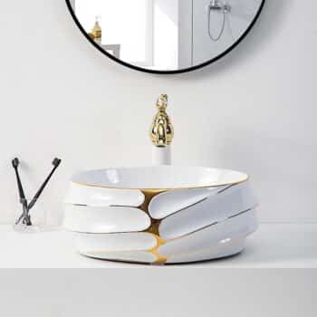 Add a touch of sophistication to your bathroom with this Luxury White & Gold Countertop Basinโ€”where contemporary design meets timeless elegance. Featuring a sculpted layered body with electroplated gold lines, this basin becomes a statement piece in any luxury home, hotel suite or designer powder room.