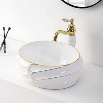 Luxury White & Gold Ceramic Countertop Basin โ€“ Modern Designer Bathroom Sink with Sculpted Layer Design